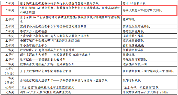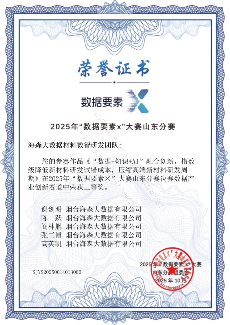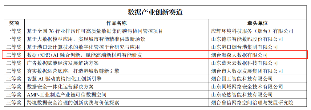 烟台海森大数据有限公司的参赛作品《“数据+知识+AI”融合创新,指数级降低新材料研发试错成本,压缩高端新材料研发周期》,成功获得数据产业创新赛道烟台选拔赛二等奖、山东分赛决赛三等奖的荣誉。